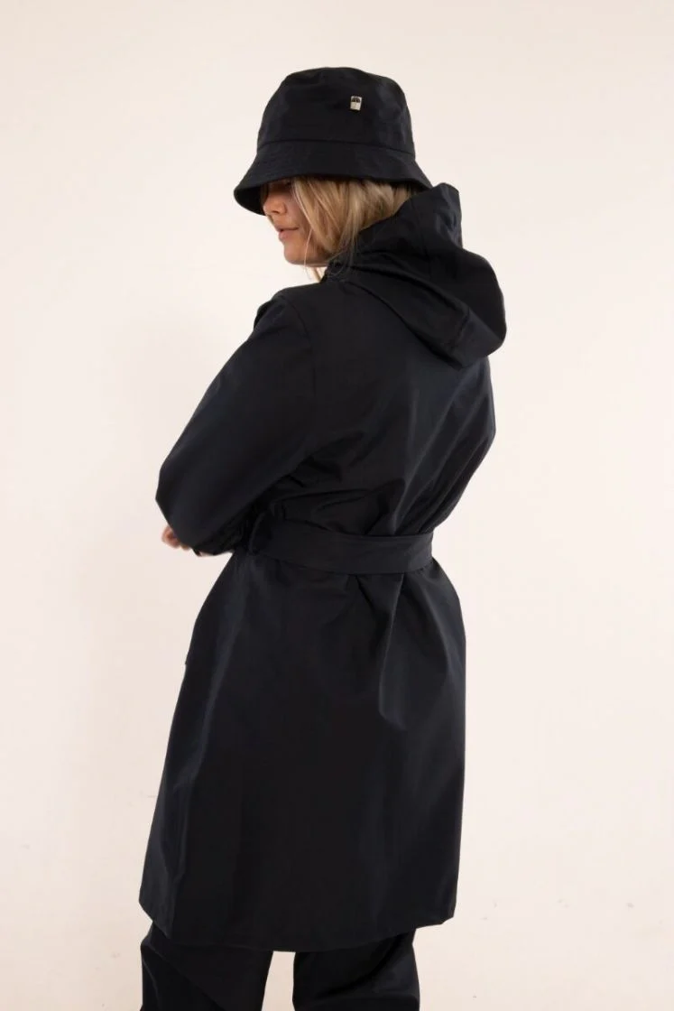 De regenjas heeft een eenvoudige, lange en vrouwelijke pasvorm met een strikceintuur om de taille.